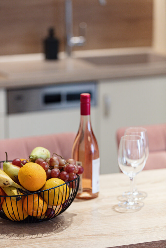 The Empneusis Suite is located on the top floor of the accommodation with a staircase in the background. This is where the living room, the bathroom and the kitchen welcome you.
