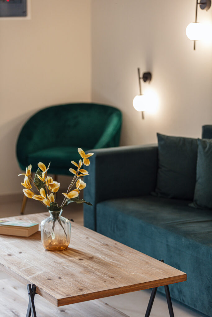 The beige, emerald and blue details create a great combination of luxury while the guests can enjoy their privacy as the suite with the closing of the inner door is divided into two different spaces.